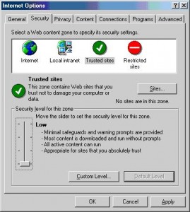 Look for the option, Security level for this zone, click the Default Level button. Note: The default level for this zone has low-level security settings. To customize individual security settings for this zone, click Custom Level button.