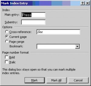 - To mark the index entry, click Mark. To mark all occurrences of the text in the document, click Mark All.